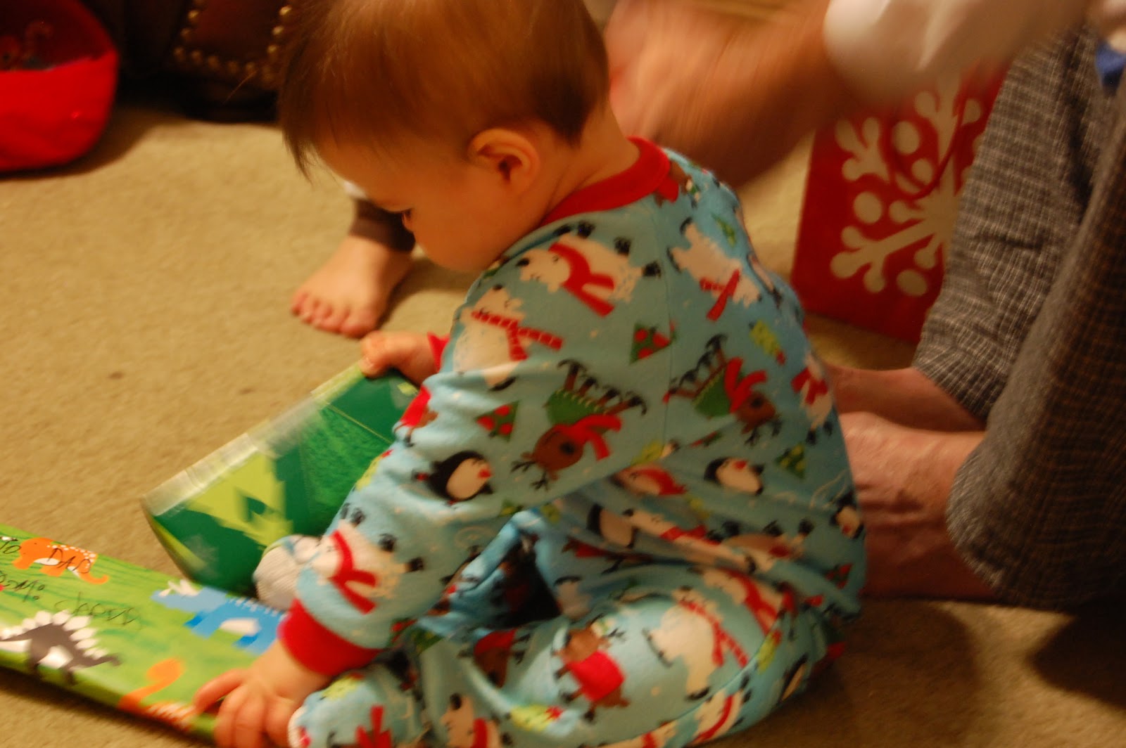 We bought the boys new jammies to wear on Christmas Eve. We gave them a warm bath after a quick Nativity from the Grandkids. Nash and Gray were the sheep. We stripped them down to their diapers and put socks on their hands. We sang picture a Christmas and all the characters walked in with their costumes on. Lasted 2 minutes. THAT is the way to do a nativity with so many little kids.